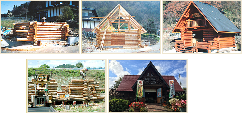 ぶどう栽培も軌道に乗り、収穫の秋を目前にひかえ、売店をどうしようかと考えたとき、「プレハブ小屋ではおもしろくない!よしっ。思い切ってログハウスを作ってみよう!」と、園主と園主の父が意気投合。チェンソーをかつぎ、山へと向かったのです。